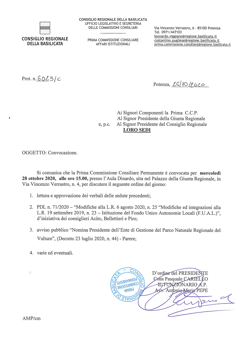 Si comunica che la Prima Commissione Consiliare Permanente è convocata per mercoledì 28 ottobre 2020, alle ore 15.00, presso 1’ Aula Dinardo, sita nel Palazzo della Giunta Regionale, in Via Vincenzo Verrastro, n. 4, per discutere il seguente ordine del giorno: