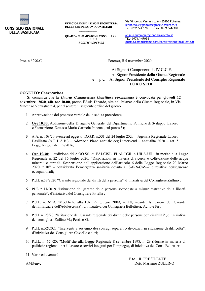 Si comunica che la Quarta Commissione Consiliare Permanente è convocata per giovedì 12 novembre 2020, alle ore 10.00, presso l’Aula Dinardo, sita nel Palazzo della Giunta Regionale, in Via Vincenzo Verrastro n.4, per discutere il seguente ordine del giorno: