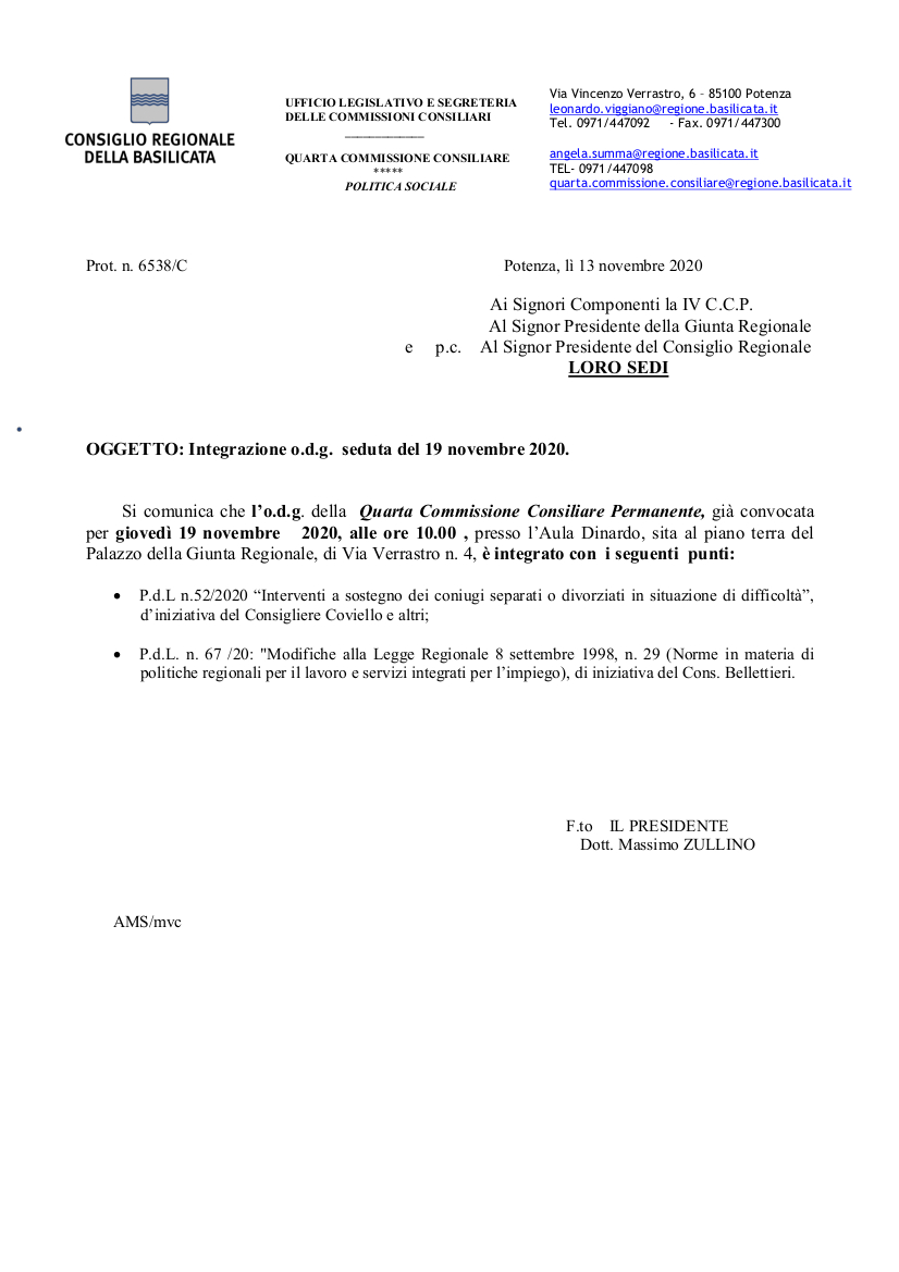 Si comunica che l’o.d.g. della Quarta Commissione Consiliare Permanente, già convocata per giovedì 19 novembre 2020, alle ore 10.00 , presso l’Aula Dinardo, sita al piano terra del Palazzo della Giunta Regionale, di Via Verrastro n. 4, è integrato con i seguenti punti: