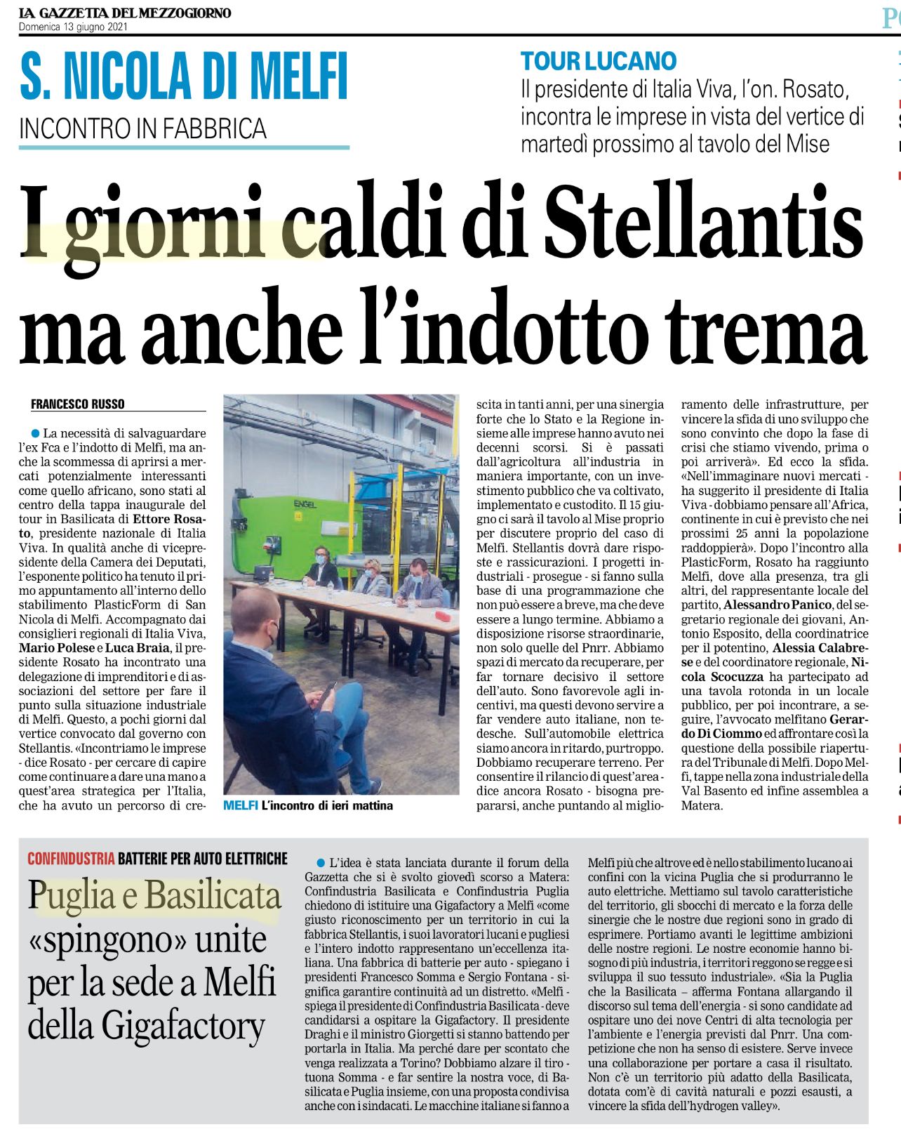 Di prima mattina Rosato ha fatto visita allo stabilimento PlasticForm di San Nicola di Melfi dove ha incontrato una delegazione di imprenditori e di associazioni del settore per fare il punto sulla situazione industriale di Stellantis e sul suo futuro in Basilicata. Chiare le sollecitazioni degli imprenditori: incentivare e sostenere la competitività delle aree industriali, attraverso formazione, sostegni mirati su investimenti e nuove aree da occupare. Stellantis è stato chiaramente l’elemento centrale della discussione, con tutte le forze lo stabilimento è da trattenere sul nostro territorio, insieme alle altre imprese dell'indotto.