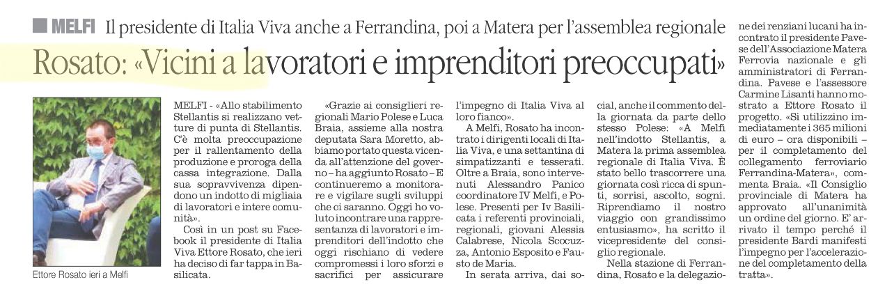 Nel pomeriggio poi, il tour è proseguito alla stazione di Ferrandina, luogo simbolo della battaglia per la ferrovia che collegata a Matera possa poi avere il prosieguo fino alle dorsali nazionali. Rosato ha quindi incontrato il presidente Pavese dell’Associazione Matera Ferrovia nazionale e gli amministratori di Ferrandina guidati dall’assessore comunale Carmine Lisanti. Nei pressi della stazione i dirigenti hanno mostrato a Ettore Rosato il progetto della ferrovia e il cronoprogramma di RFI: “Si devono utilizzare immediatamente i 365 milioni di euro ora disponibili per il completamento del collegamento ferroviario Ferrandina-Matera”. A Rosato sono state illustrate le varie tematiche e spiegato che “l'altro giorno è intervenuto anche il Consiglio provinciale di Matera, sul tema, approvando all'unanimità un ordine del giorno, rispondendo alle sollecitazioni di Braia dopo i tavoli romani con sottosegretario Teresa Bellanova e con il presidente della provincia Piero Marrese. Il presidente nazionale di Italia Viva Rosato ha poi effettuato una visita all’azienda Sydex e al sito dove potenzialmente potrebbe realizzarsi la Piattaforma logistica Agroalimentare incontrando alcuni imprenditori nella zona industriale della Val Basento.
