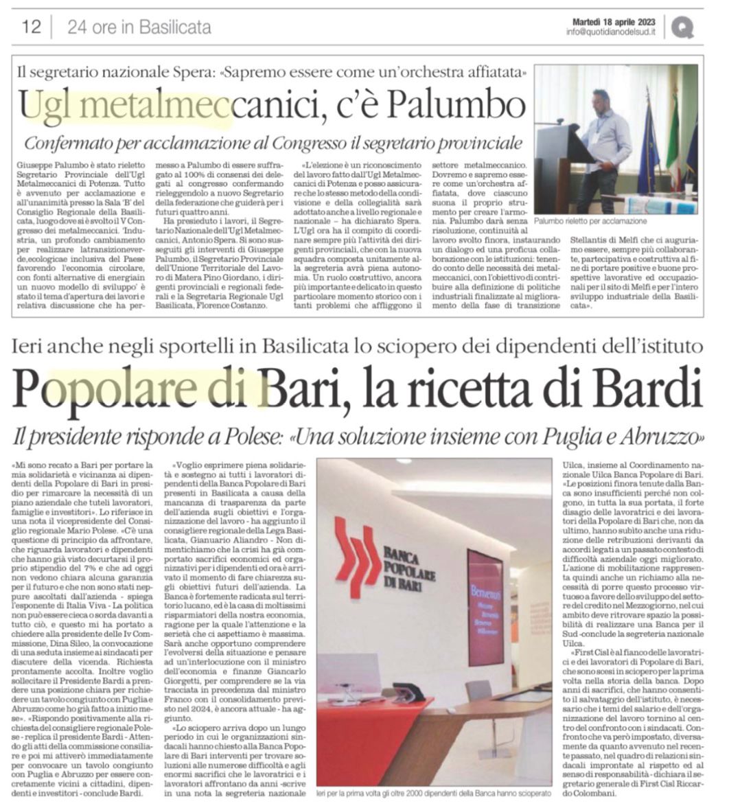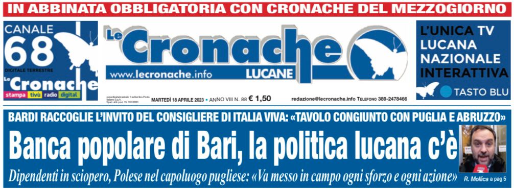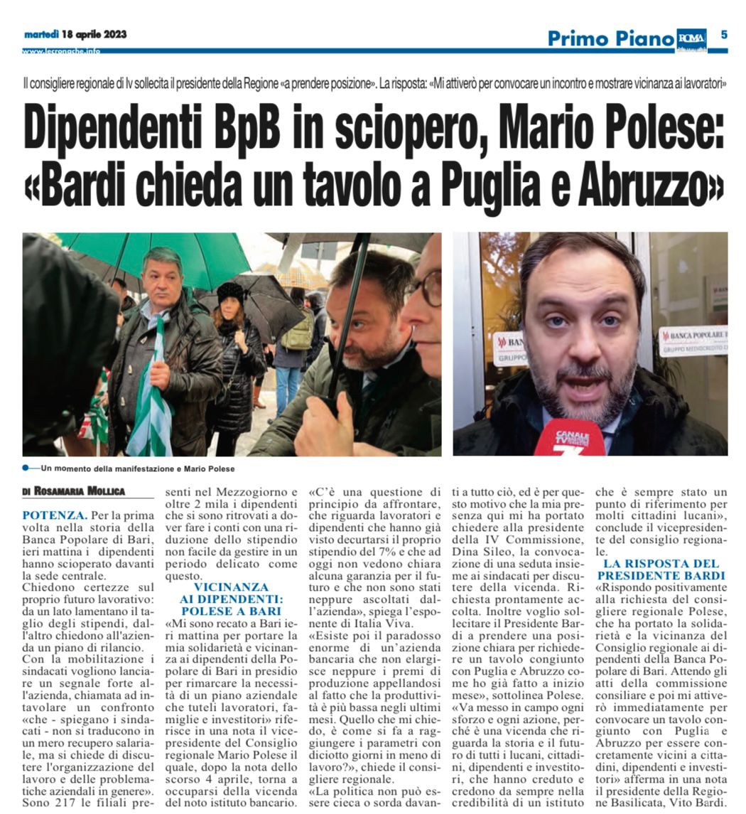 Potenza, 21 aprile 2023. “Prosegue serrato il percorso istituzionale della Regione Basilicata a favore di una soluzione per la Banca Popolare di Bari di cui mi ero fatto portatore a margine dello sciopero dei dipendenti di lunedì scorso”, dichiara il vicepresidente del Consiglio regionale della Basilicata, Mario Polese di Italia Viva che spiega: “Ieri la questione è stata oggetto di un approfondimento, come da me richiesto e come subito accordato dalla presidente Dina Sileo, nel corso della riunione della Quarta Commissione permanente del Consiglio regionale. Sono state ascoltate le parti sindacali che hanno potuto quindi esporre i problemi della Bpb in relazione alla parte lucana”. “Nella mia presentazione - sottolinea Polese - ho ribadito la gravità della situazione e il disagio che si percepisce tra i dipendenti e che inevitabilmente tocca anche i risparmiatori. In buona sostanza ho chiesto, in linea con quanto auspicato dai sindacati di settore, che il presidente della Regione, Vito Bardi si faccia carico di un incontro con i colleghi delle altre regioni interessate per trovare una soluzione unitaria”. Il vicepresidente del Consiglio regionale ha quindi aggiunto: “Bene che alla fine che la Commissione abbia preso l’impegno per la stesura di un documento, a cui sono stato delegato per la sintesi, che si faccia carico delle osservazioni sindacali al fine di convocare un tavolo istituzionale dando mandato al presidente Bardi al fine di intervenire con le istituzioni delle altre regioni per trovare una soluzione definitiva alla crisi della BpB che non penalizzi in alcun modo la Basilicata”. “Vigilerò personalmente che non si perda tempo perché il futuro della nostra Regione passa anche da queste iniziative”, conclude Polese.