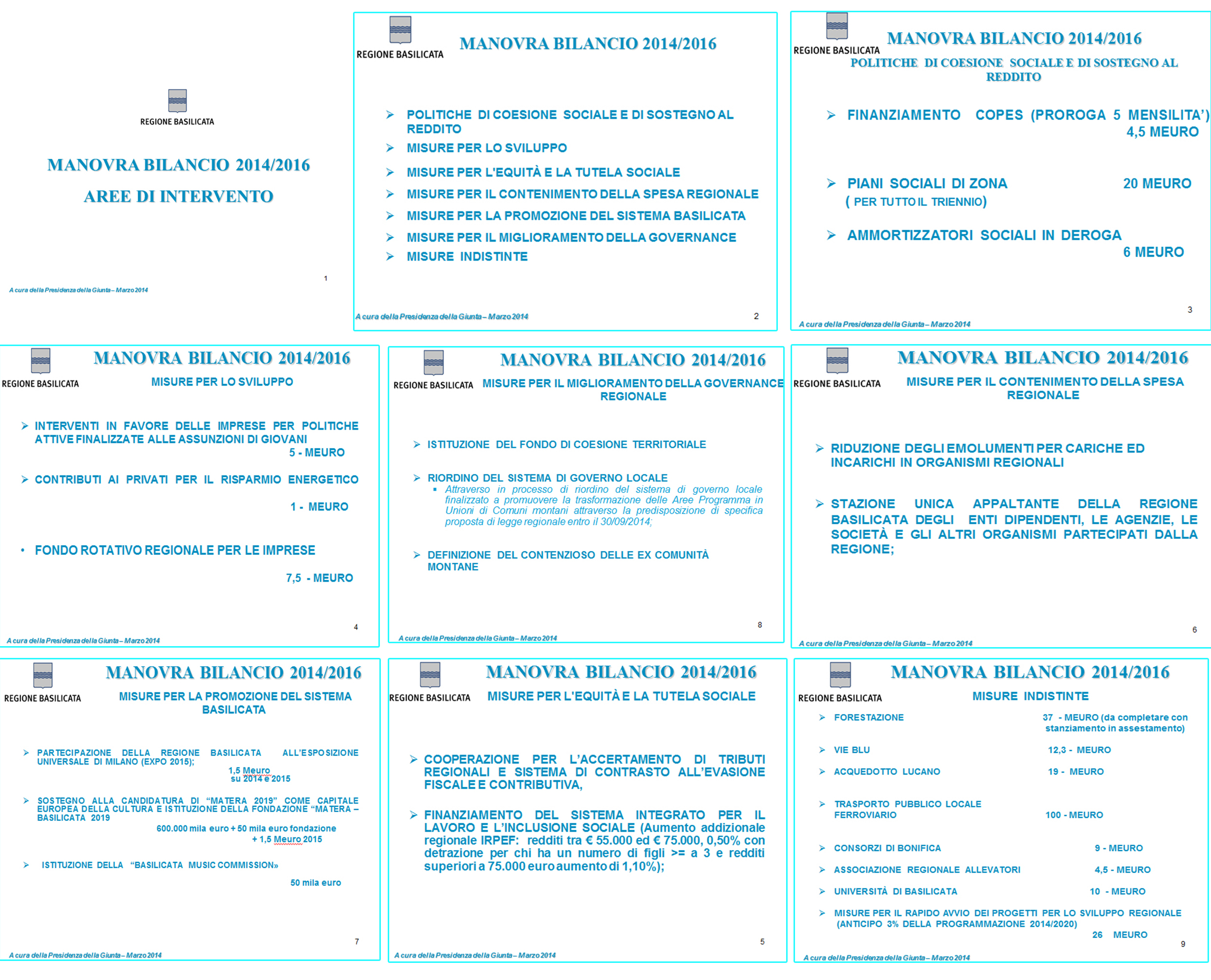 Equità e tutela sociale. Sostegno all’economia. Governance e cooperazione territoriale. Sono i tre punti chiave della manovra finanziaria regionale per il prossimo biennio. I disegni di legge “Legge di Stabilità regionale 2014”, “Legge di Bilancio 2014-2016” e con essa il “Collegato alla Legge di Bilancio 2014”, avvengono a ridosso di un obbligato esercizio provvisorio, determinato dalla fine anticipata della scorsa legislatura, ma già fiaccato da un periodo di lunga incertezza programmatoria e di vacatio istituzionale.