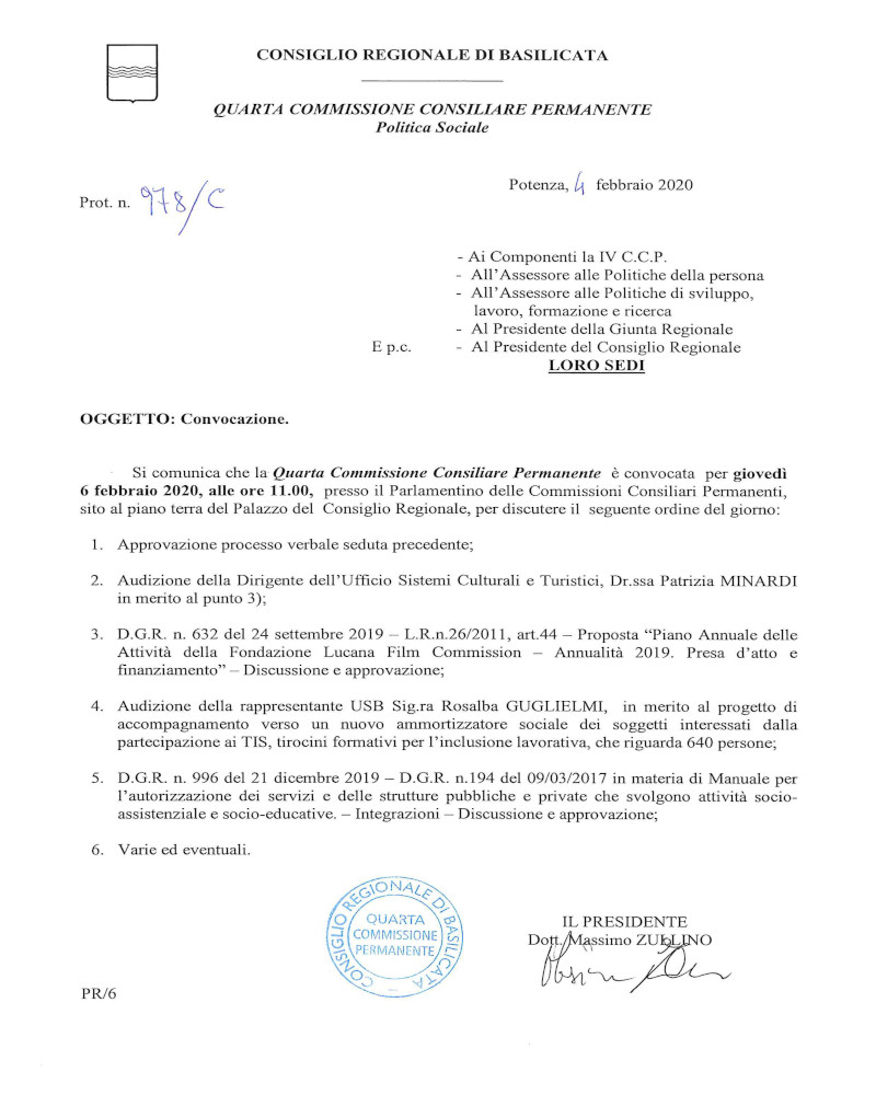 Si comunica che la Quarta Commissione Consiliare Permanente è convocata per giovedì 6 febbraio 2020, alle ore 11.00, presso il Parlamentino delle Commissioni Consiliari Permanenti, sito al piano terra del Palazzo del Consiglio Regionale, per discutere il seguente ordine del giorno: