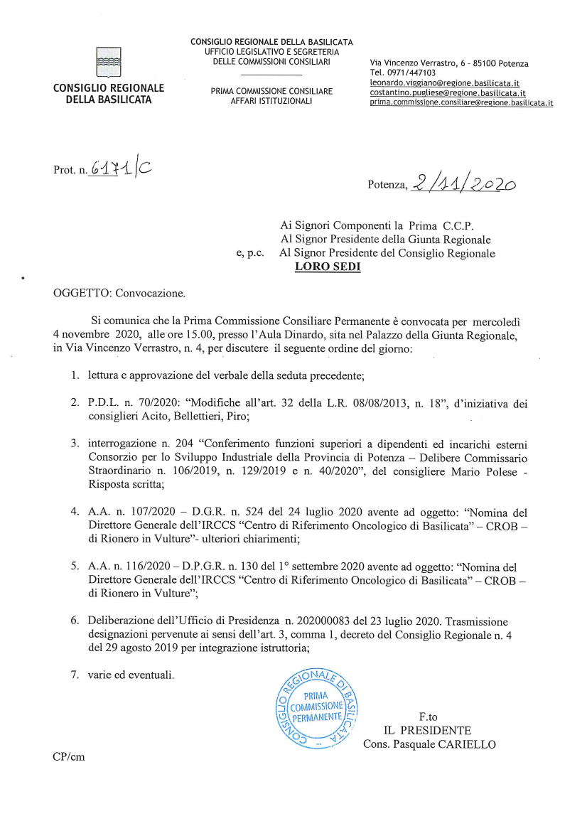 Si comunica che la Prima Commissione Consiliare Permanente, già convocata per mercoledì 4 novembre 2020, alle ore 15.00, presso l'Aula Dinardo, sita nel Palazzo della Giunta Regionale, in Via Vincenzo Verrastro, n. 4, è rinviata a domani, giovedì 5 novembre 2020, alle ore 15.00, con lo stesso ordine del giorno.