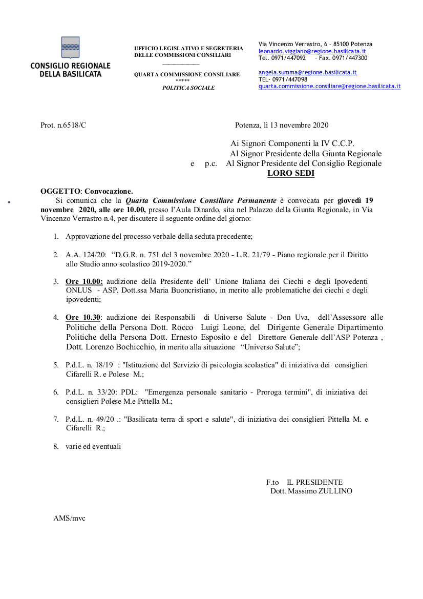 Si comunica che l’o.d.g. della Quarta Commissione Consiliare Permanente, già convocata per giovedì 19 novembre 2020, alle ore 10.00 , presso l’Aula Dinardo, sita al piano terra del Palazzo della Giunta Regionale, di Via Verrastro n. 4, è integrato con i seguenti punti: