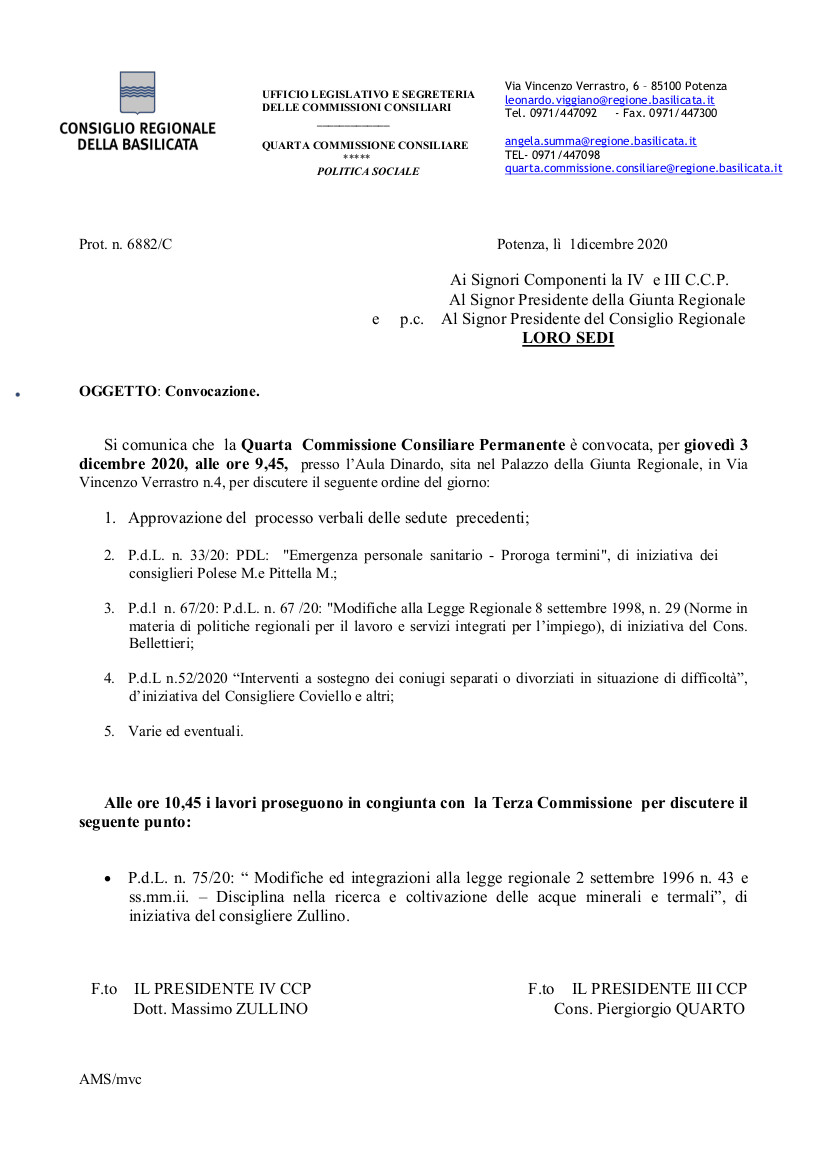 Si comunica che la Quarta Commissione Consiliare Permanente è convocata, per giovedì 3 dicembre 2020, alle ore 9,45, presso l’Aula Dinardo, sita nel Palazzo della Giunta Regionale, in Via Vincenzo Verrastro n.4, per discutere il seguente ordine del giorno: