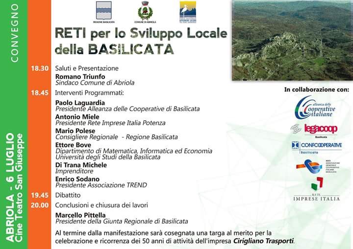 Ore 18.00 - 20.00 Convegno "Reti per lo sviluppo locale della Basilicata", Cine teatro San Giuseppe, Abriola